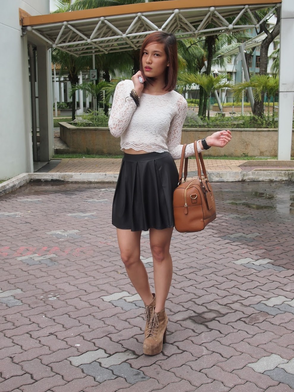 (Lace crop top, H&M. Leather skater skirt, Miss Selfridge)